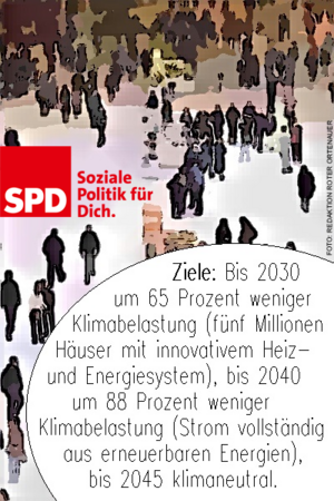 Bis 2030 um 65 Prozent weniger Klimabelastung (fünf Millionen Häuser mit innovativem Heiz- und Energiesystem), bis 2040 um 88 Prozent weniger Klimabelastung (Strom vollständig aus erneuerbaren Energien), bis 2045 klimaneutral.