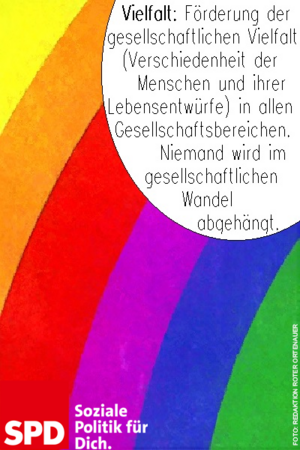 Förderung der gesellschaftlichen Vielfalt (Verschiedenheit der Menschen und ihre Lebensentwürfe) in allen Gesellschaftsbereichen. Niemand wird im gesellschaftlichen Wandel abgehängt.