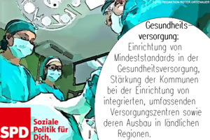 Einrichtung von Mindeststandards in der Gesundheitsversorgung. Stärkung der Kommunen bei der Einrichtung von integrierten, umfassenden Versorgungszentren sowie deren Ausbau in ländlichen Regionen.
