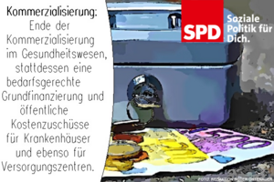 Ende der Kommerzialisierung im Gesundheitswesen, stattdessen eine bedarfsgerechte Grundfinanzierung und öffentliche Kostenzuschüsse für Krankenhäuser und ebenso für Versorgungszentren.